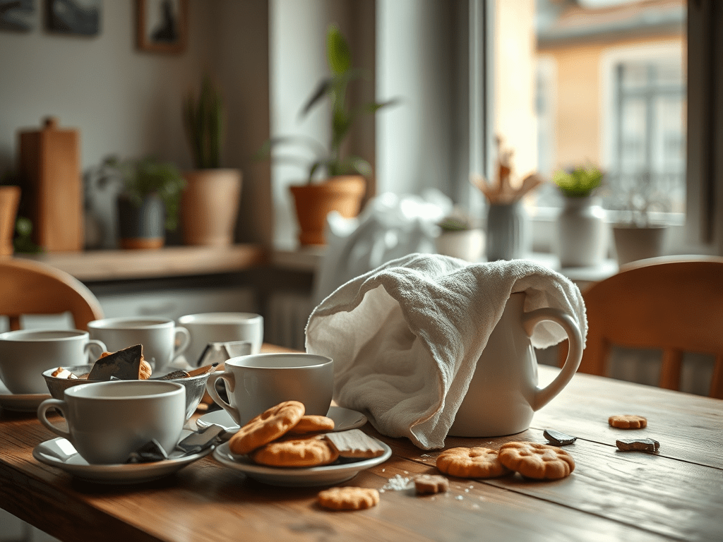[Setting: A cozy apartment in Berlin. The kitchen table is cluttered with coffee cups, biscuits, and… shards of a broken mirror wrapped in a towel.]