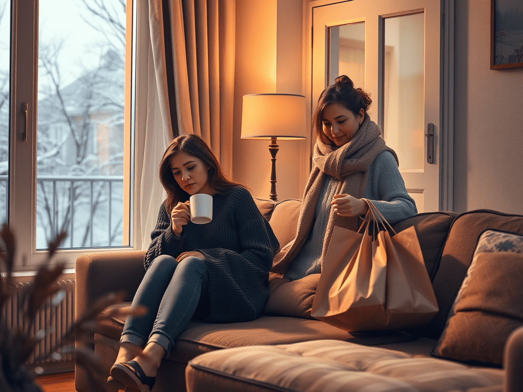 Scene: A cozy Moscow apartment. It’s late evening, snow falling softly outside. Yulia is sitting on the couch with tea, watching the clock. Anya enters, scarf unwinding, holding grocery bags.
